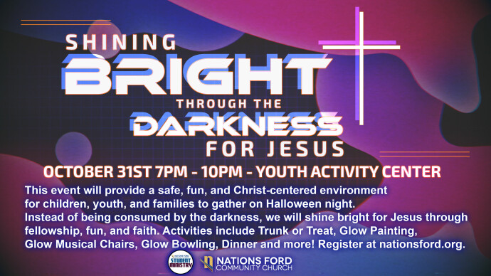 “Shining Bright Through the Darkness for Jesus” Date: Friday, October 31, 2025 Time: 7PM – 10PM Location: Nations Ford Community Church...